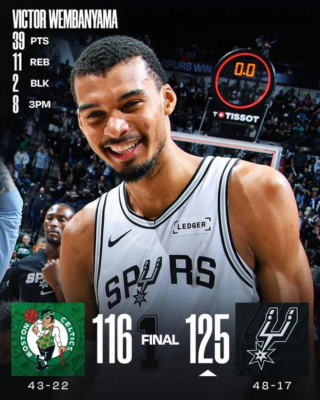 文班39+11马刺擒凯尔特人5连胜 塔图姆24+5布朗被逐